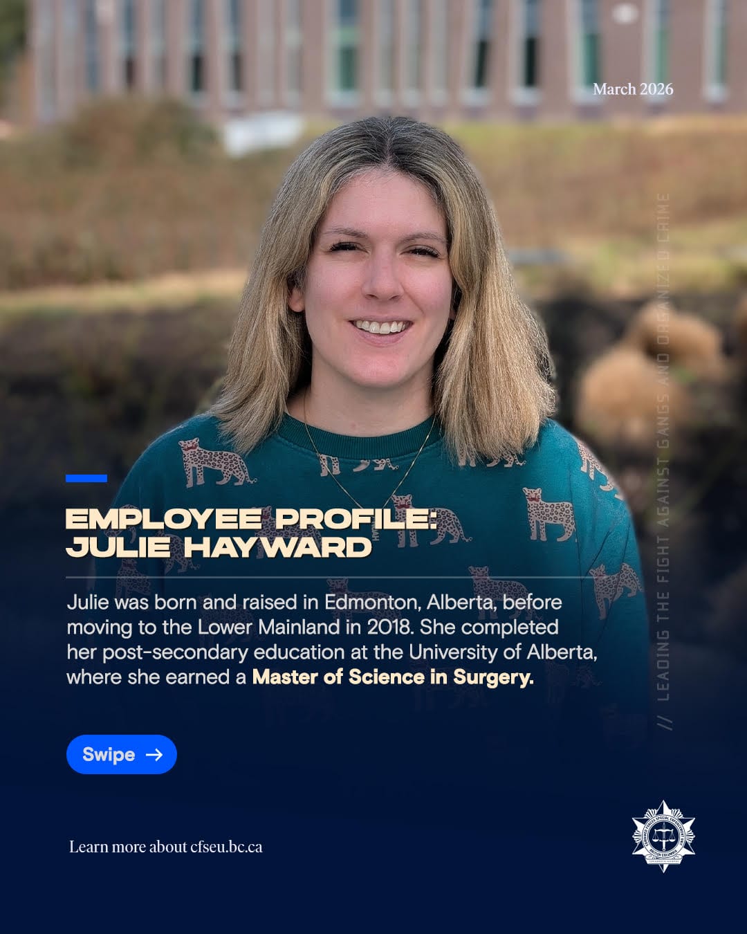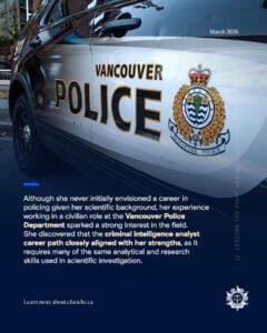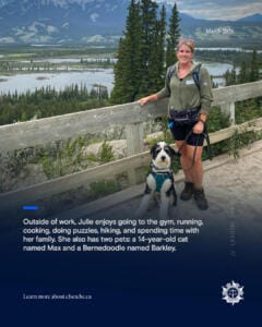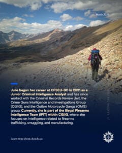 Julie was born and raised in Edmonton, Alberta, before moving to the Lower Mainland in 2018. She completed her post-secondary education at the University of Alberta, where she earned a Master of Science in Surgery. Her academic specialization focused on islet transplantation research for the treatment of Type I Diabetes. During her studies, she published a paper in the journal Diabetes titled “Cotransplantation of Mesenchymal Stem Cells with Neonatal Porcine Islets Improve Graft Function in Diabetic Mice.” Although she never initially envisioned a career in policing given her scientific background, her experience working in a civilian role at the Vancouver Police Department sparked a strong interest in the field. She discovered that the criminal intelligence analyst career path closely aligned with her strengths, as it requires many of the same analytical and research skills used in scientific investigation. She began her career at CFSEU-BC in 2021 as a Junior Criminal Intelligence Analyst and has since worked with the Criminal Records Review Unit, the Crime Guns Intelligence and Investigations Group (CGIIG), and the Outlaw Motorcycle Gangs (OMG) group. Currently, she is part of the Illegal Firearms Intelligence Team (IFIT) within CGIIG, where she focuses on intelligence related to firearms trafficking, smuggling, and manufacturing. Outside of work, Julie enjoys going to the gym, running, cooking, doing puzzles, hiking, and spending time with her family. She also has two pets: a 14-year-old cat named Max and a Bernedoodle named Barkley.