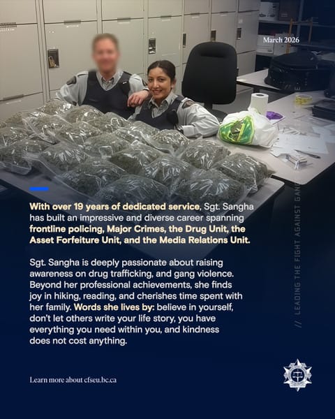 CFSEU-BC is proud to welcome Sgt. Sangha to the Media Relations Unit. She brings invaluable insight into the complexities of the drug trade, gang activity, and the public safety issues that matter most to the people of British Columbia. Her knowledge, credibility, and commitment strengthen our mission to keep communities safe and informed.