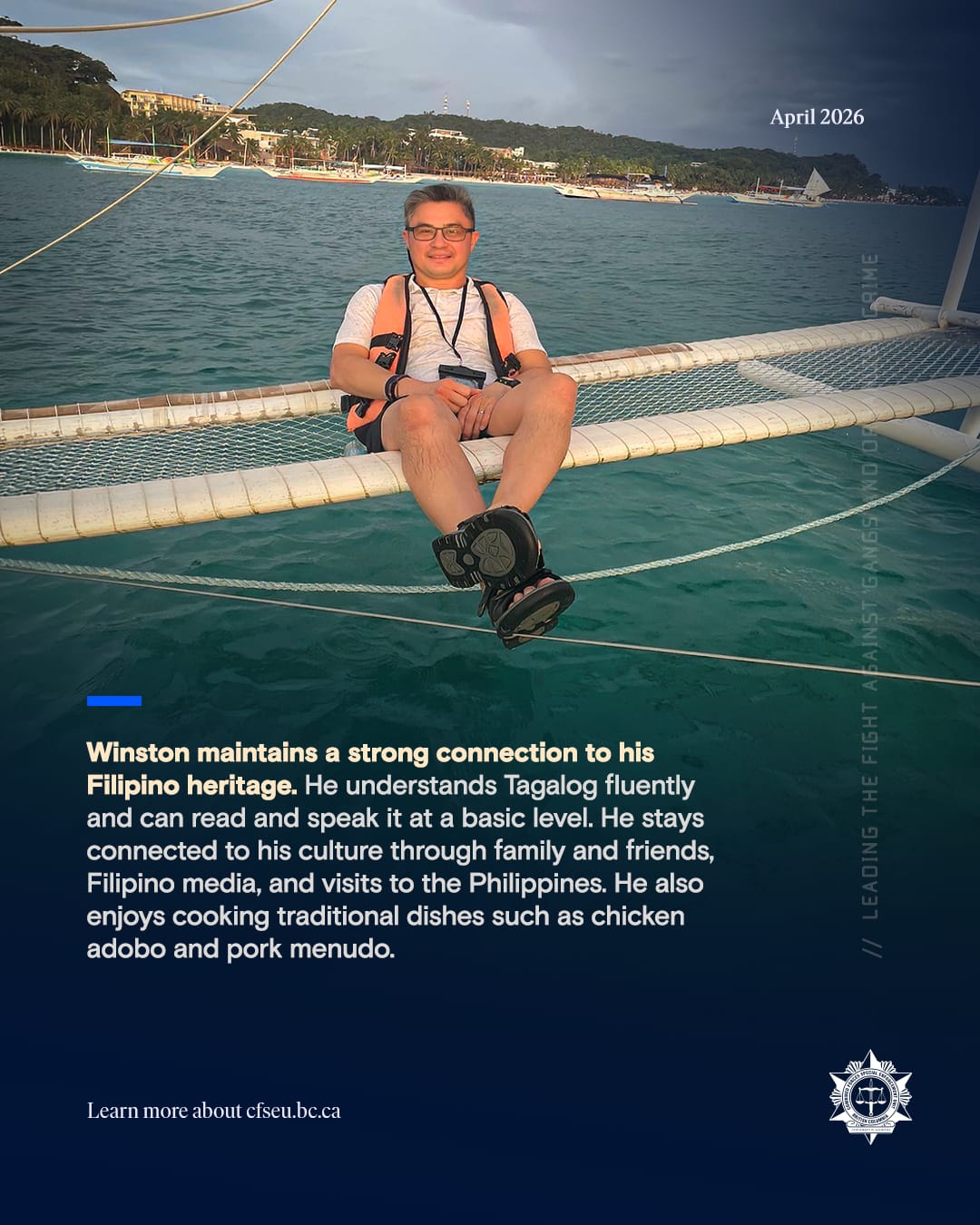 Winston maintains a strong connection to his Filipino heritage. He understands Tagalog fluently and can read and speak it at a basic level. He stays connected to his culture through family and friends, Filipino media, and visits to the Philippines. He also enjoys cooking traditional dishes such as chicken adobo and pork menudo.