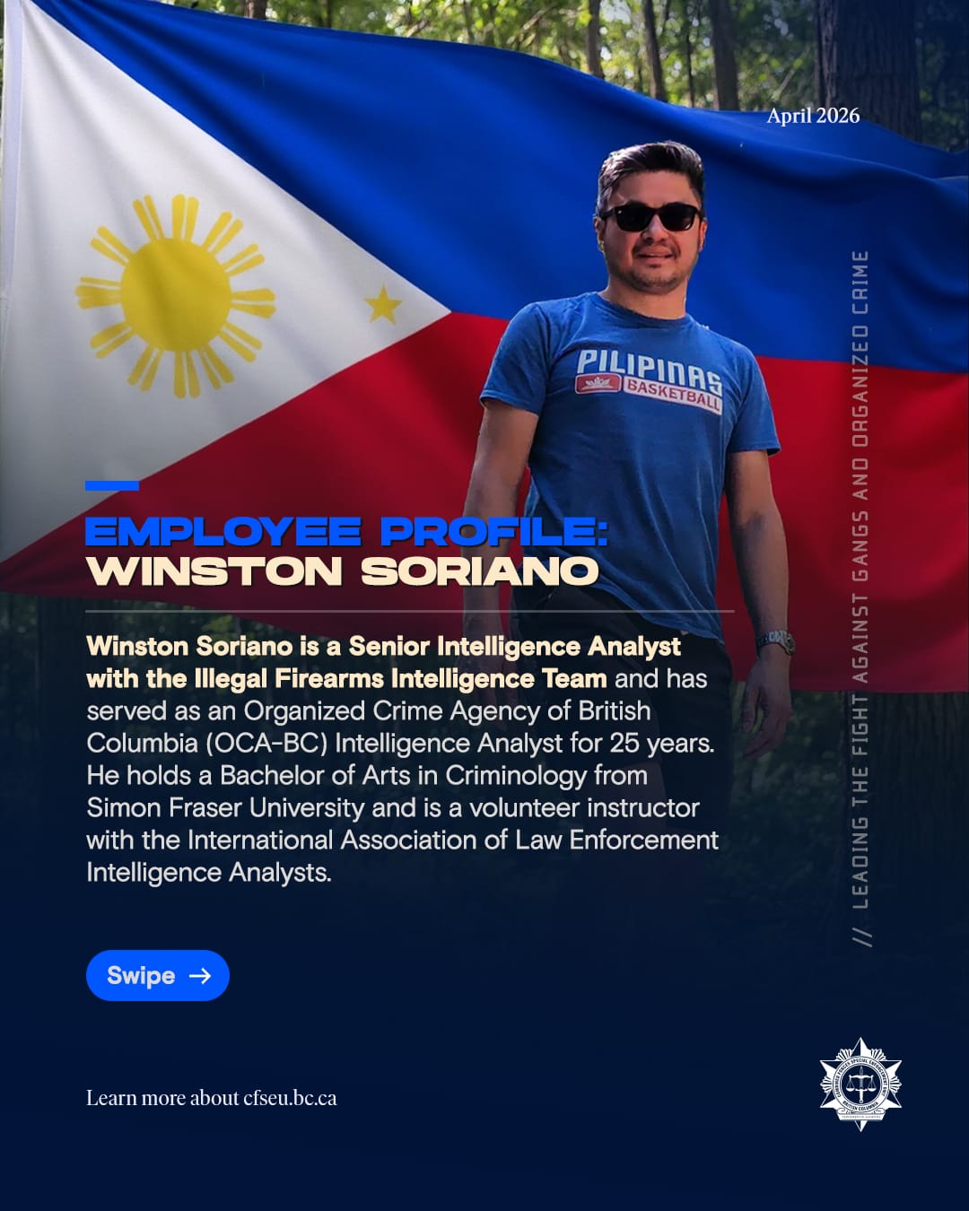 Winston Soriano is a Senior Intelligence Analyst with the Illegal Firearms Intelligence Team and has served as an OCA Intelligence Analyst for 25 years. He holds a Bachelor of Arts in Criminology from Simon Fraser University and is a volunteer instructor with the International Association of Law Enforcement Intelligence Analysts.