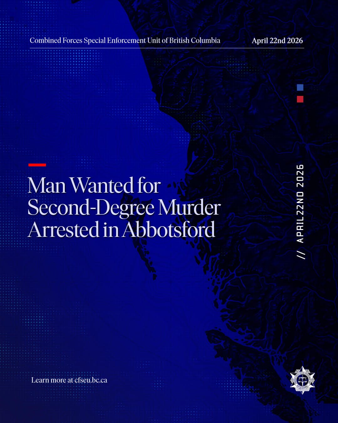 On April 21, 2026, at approximately 12:50 p.m., the Combined Forces Special Enforcement Unit of British Columbia (CFSEU-BC) arrested a man in Abbotsford who was the subject of a Canada-wide warrant for second-degree murder out of Calgary.